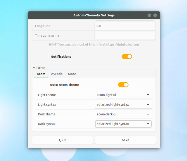除了自动更改 Gtk3 主题外,**AutomaThemely 还可以自动切换 Atom 编辑器和 VSCode 的明暗主题,以及 Atom 编辑器的明暗语法高亮。**这显然也是基于一天中的时间完成的。
