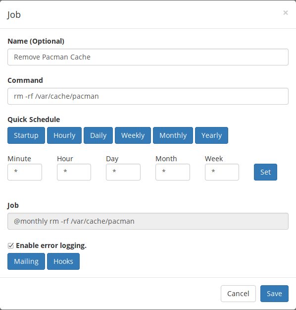如你所见,我设置了一个每月清理 pacman 缓存的 Cron 定时任务。你也可以设置多个 Cron 定时任务,都能在控制台页面看到。