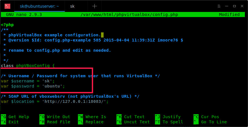 $ sudo nano /var/www/html/phpvirtualbox/config.php