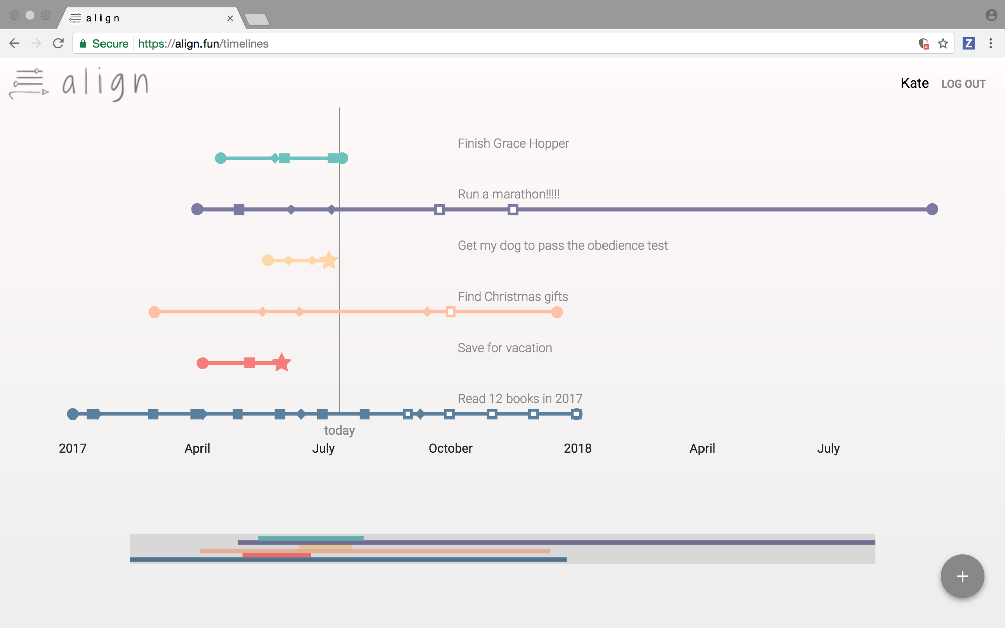 首先,简单的说两句。Align 是一个 web 应用,它使用直观的时间线界面帮助用户管理时间、设定长期目标。我们的技术栈有:用于后端服务的 Firebase 和用于前端的 React。我和我的队友在这个短视频中解释的更详细。