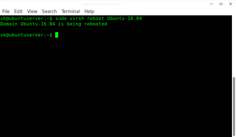 重启动一个虚拟机,运行如下命令:$ sudo virsh reboot Ubuntu-16.04