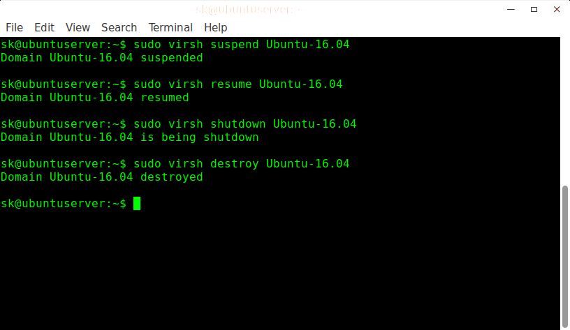 使用管理用户接口 virsh 从命令行去管理虚拟机是非常有趣的。命令非常容易记。我们来看一些例子。