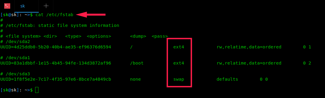 └─sda3 swap 1f8f5e2e-7c17-4f35-97e6-8bce7a4849cb [SWAP]