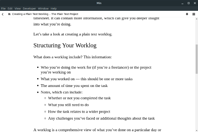 Min 基于 Electron 框架开发,值得一提的是,Atom 文本编辑器也是基于这个框架开发的。它提供 Linux、MacOS 和 Windows 的安装程序,当然也可以从 GitHub 获取它的源代码自行编译安装。