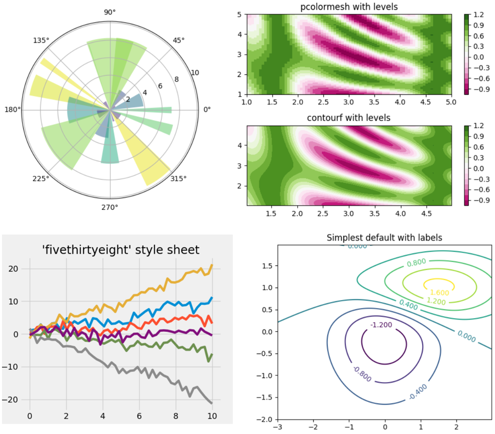 Matplotlib 是应用最广泛的 2D Python 可视化库。它包含海量的命令和接口,可以让你根据数据生成高质量的图表。要学习使用 Matplotlib,可以参考这篇详尽的文章