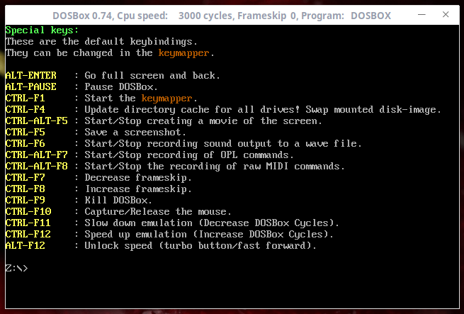 正如你所看到的,DOSBox 带有自己的类似 DOS 的命令提示符和一个虚拟的 Z:\ 的驱动器,如果你熟悉 MS-DOS 的话,你会发现在 DOSBox 环境下工作不会有任何问题。