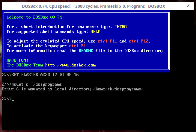 Drive C is mounted as local directory /home/sk/dosprograms.