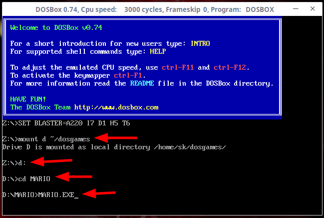 从 这里 下载 Mario 游戏,并将其解压到 Linux 中的 ~/dosgames 目录。