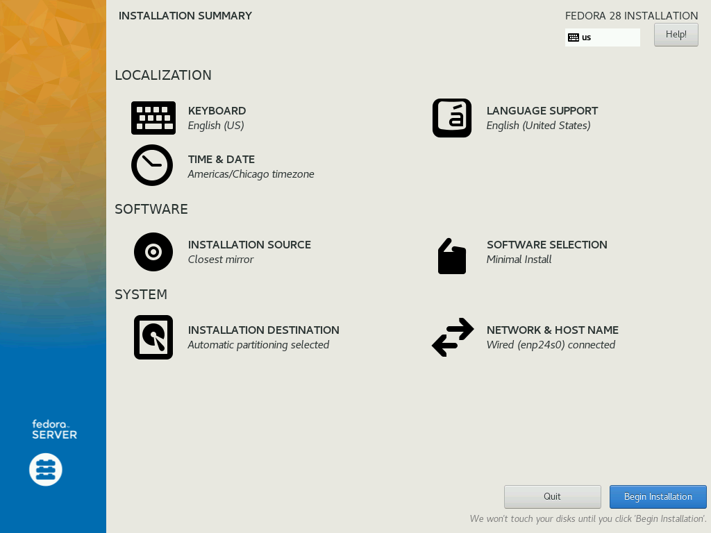 首先去下载 Fedora 服务器的 netinst 镜像,将它刻录到一张光盘上,然后用它引导服务器来重新格式化。我们只需要一个典型的 Fedora Server 的“最小化安装”来作为我们的开端,安装完成后,我们可以使用命令行去添加我们需要的任何额外的包。