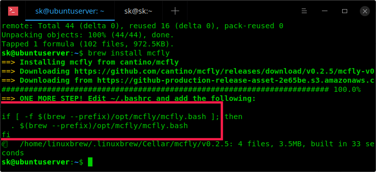 在 Linux 中,McFly 可以使用 Linuxbrew 来安装。如若你还没有安装过 Linuxbrew,那么你可以参考下面的这个链接。(LCTT 译注:从其 GitHub 主页了解到也可以下载其二进制来使用。)