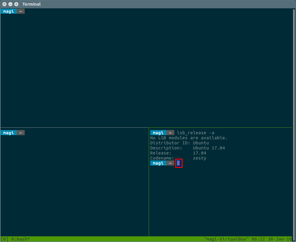 出于测试目的,我们将在窗格之间移动。现在我们在 pane2 中,它展示了 lsb_release -a 命令的输出。