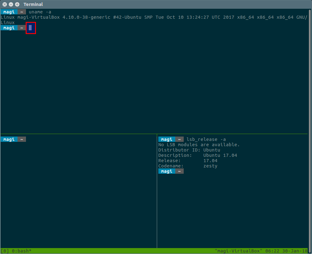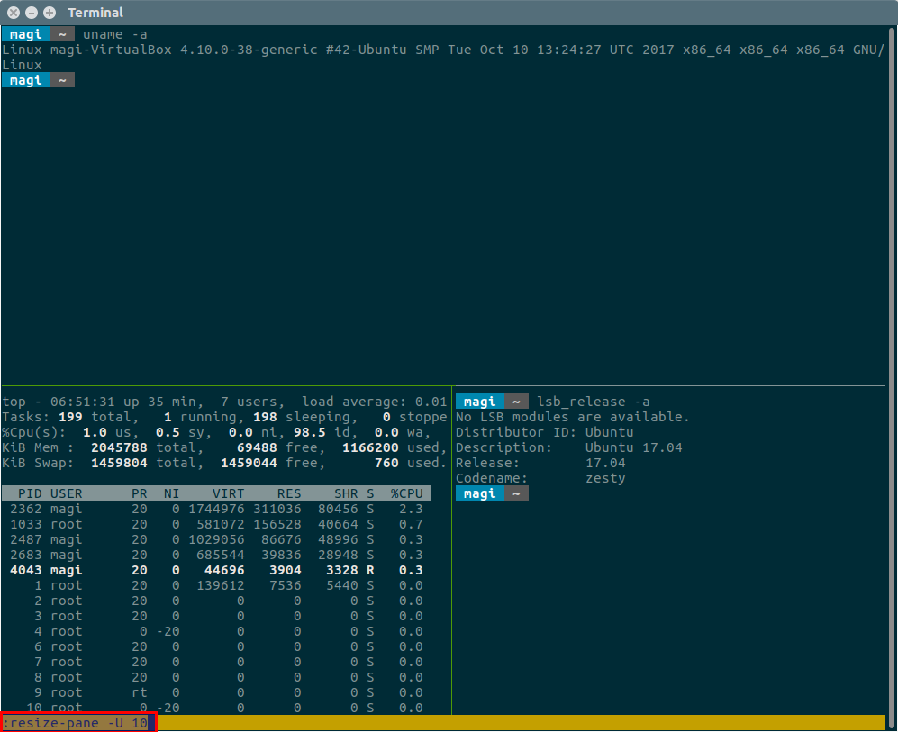 我们将移动到 pane0,它显示 uname -a 命令的输出。