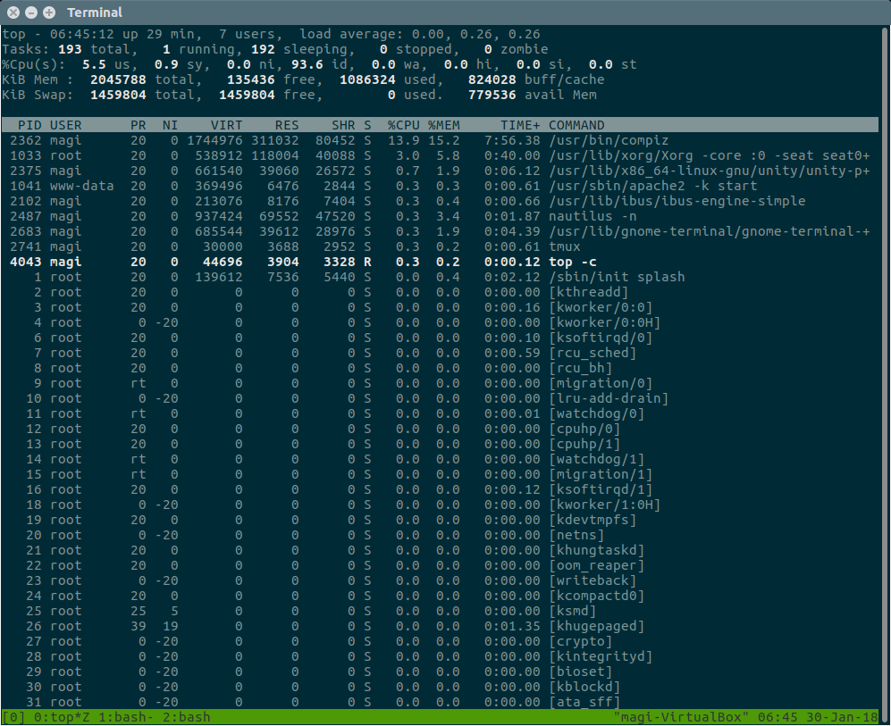 目前我们有三个窗格,我在 pane1 工作,它使用 top 命令显示系统活动信息,我将缩放它。