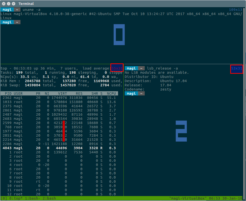 我有两个窗口,第一个窗口有三个窗格,其中包含操作系统版本信息,top 命令输出和内核信息。