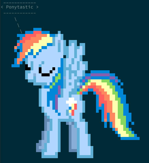 “嗯,我一直在玩一个叫 ponysay 的东西,它似乎是你的 cowsay 的彩色变种。”