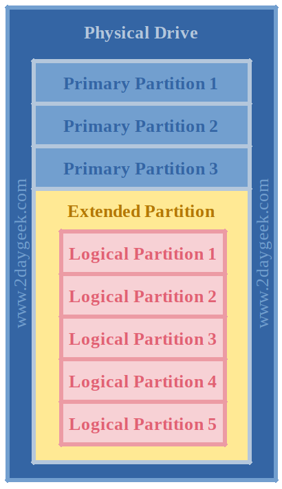 fdisk 允许我们在每块硬盘上创建最多四个主分区。它们中的其中一个可以作为扩展分区,并下设多个逻辑分区。1-4 扇区作为主分区被保留,逻辑分区从扇区 5 开始。