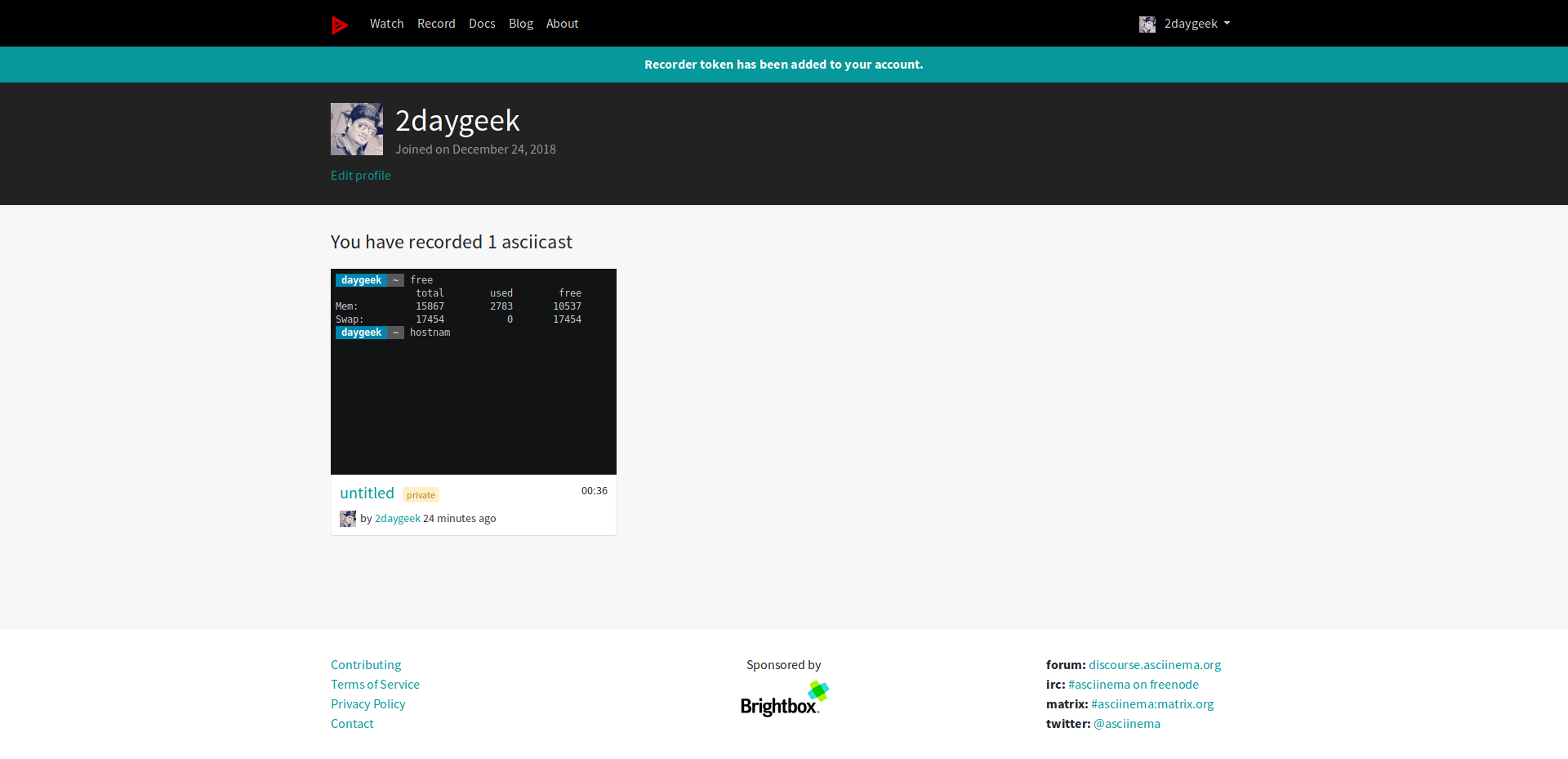 如果你想要留存所有在这个机器上录制的片段,点击上述显示的链接并使用你在 asciinema.org 的账户登录,然后跟随这个说明继续操作,来将你的机器和该网站连接起来。