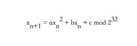 不幸的是,对为什么使用如此少的指令能够产生如此长的序列的原因的研究,已经远超出了本课程的教学范围。但我还是鼓励有兴趣的人去研究它。它的全部核心所在就是下面的二次方程,其中 xn 是产生的第 n 个随机数。