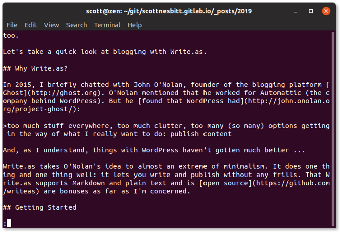 less 的美妙之处在于它易于使用,它将你正在查看的文件分解为块(或页面),这使得它们更易于阅读。你可以使用它在命令行查看文本文件,例如 README、HTML 文件、LaTeX 文件或其他任何纯文本文件。我在上一篇文章中介绍了 less。