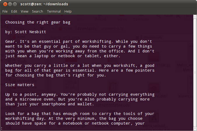 作为一个优秀的开源公民,你会希望尽可能多地使用开放格式。对于你的文字处理需求,你可能需要处理 ODT 文件(由诸如 LibreOffice Writer 和 AbiWord 等文字处理器使用)而不是 Word 文件。即使没有,也可能会遇到 ODT 文件。而且,即使你的计算机上没有安装 Writer 或 AbiWord,也很容易在命令行中查看它们。