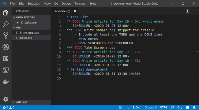 Org,本质上,是一个结构化的文本文件。它有标题、子标题,以及各种关键字,其他工具可以根据这些关键字将文件解析成日程表和代办列表。Org 文件可以被任何纯文本编辑器编辑(例如,Vim、Atom 或 Visual Studio Code),而且很多编辑器都有插件可以帮你创建和管理 Org 文件。