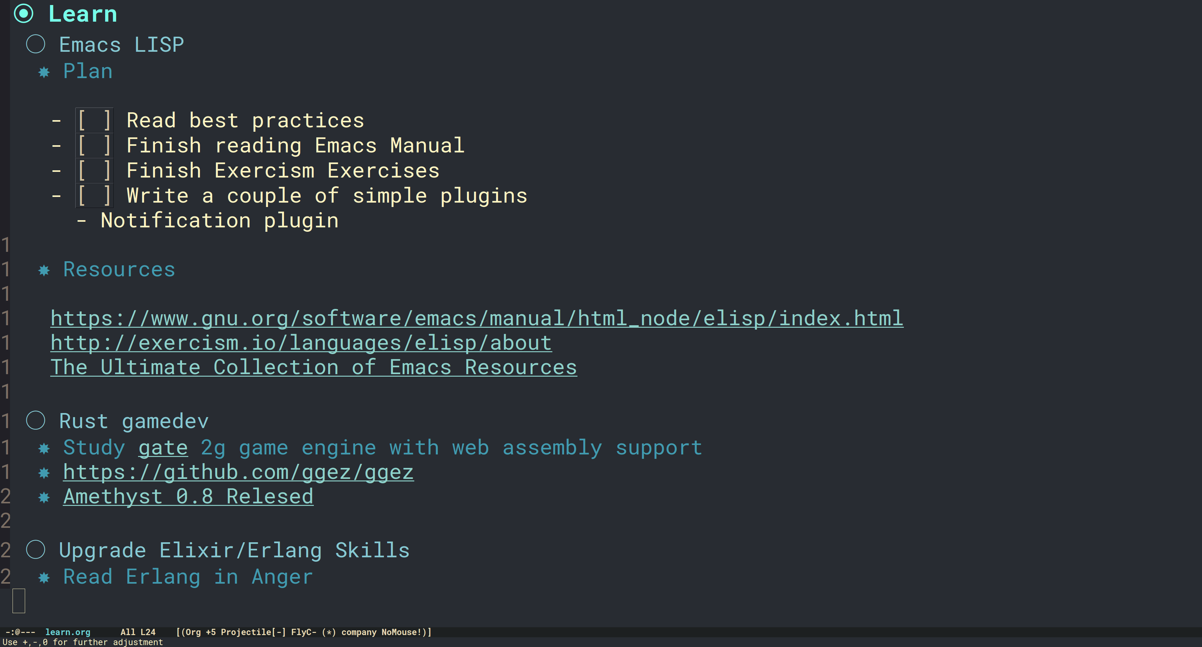 Org 模式最基本的应用场景就是以笔记的形式记录下你想记住的事情。比如,下面是我正在学习的笔记内容: