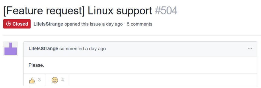 在部分吃瓜群众面对 VS 枯坐时,另一些吃瓜群众决定打开他们的脑洞。已关闭的 issue 中包含了一些特别的提问:提出者想要知道能不能在 Linux / MacOS 中使用这个项目,但被项目组人员告知目前没有将它登陆其他平台的打算。