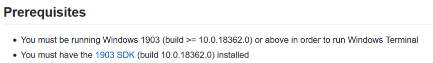 “前提条件:你需要 Windows 1903 或以上版本以运行 Windows Terminal.”