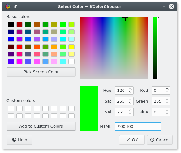 在以上示例代码中,0,255,0 被我们使用,它在 RGB 中所代表的值与 #00ff00 在十六进制中所代表的值相同。你可以通过一个优秀的图像应用程序,如 GIMP、Krita 或 Inkscape,来获取所有这些颜色值。或者,你可以使用一个优秀的系统级颜色选择器,如 KColorChooser,来检测颜色。
