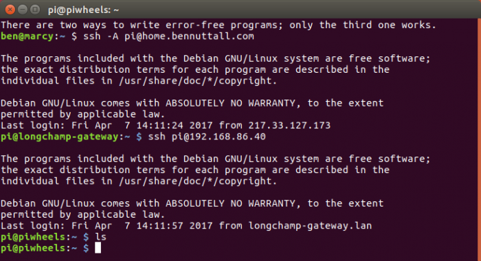 使树莓派安全后,让它在线,你将可以在世界的任何地方登录你的网络。一旦你登录到你的树莓派,你可以用 SSH 访问本地网络上的局域网地址(例如,192.168.1.31)访问其他设备。如果你在这些设备上有密码,用密码就好了。如果它们同样只允许 SSH 密匙,你需要确保你的密匙通过 SSH 转发,使用 -A 参数:ssh -A pi@123.45.67.89