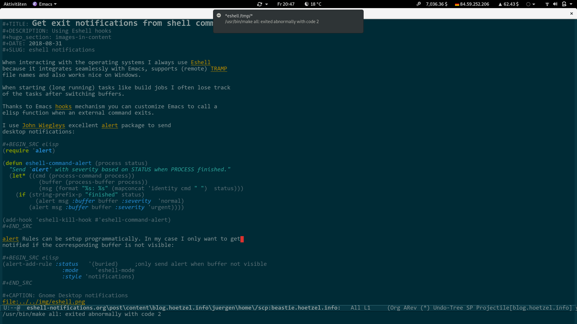 这甚至对于 TRAMP 也一样生效。下面这个截屏展示了失败的 make 命令产生的 Gnome 桌面通知。