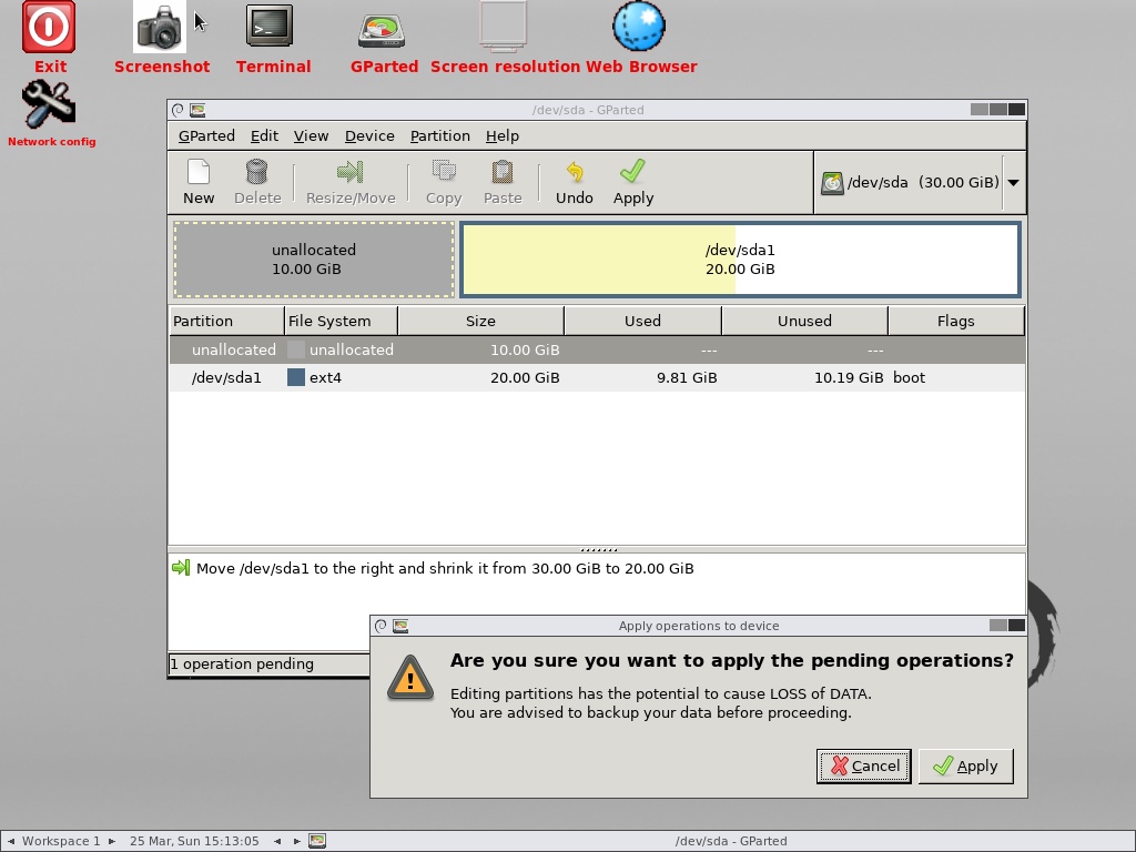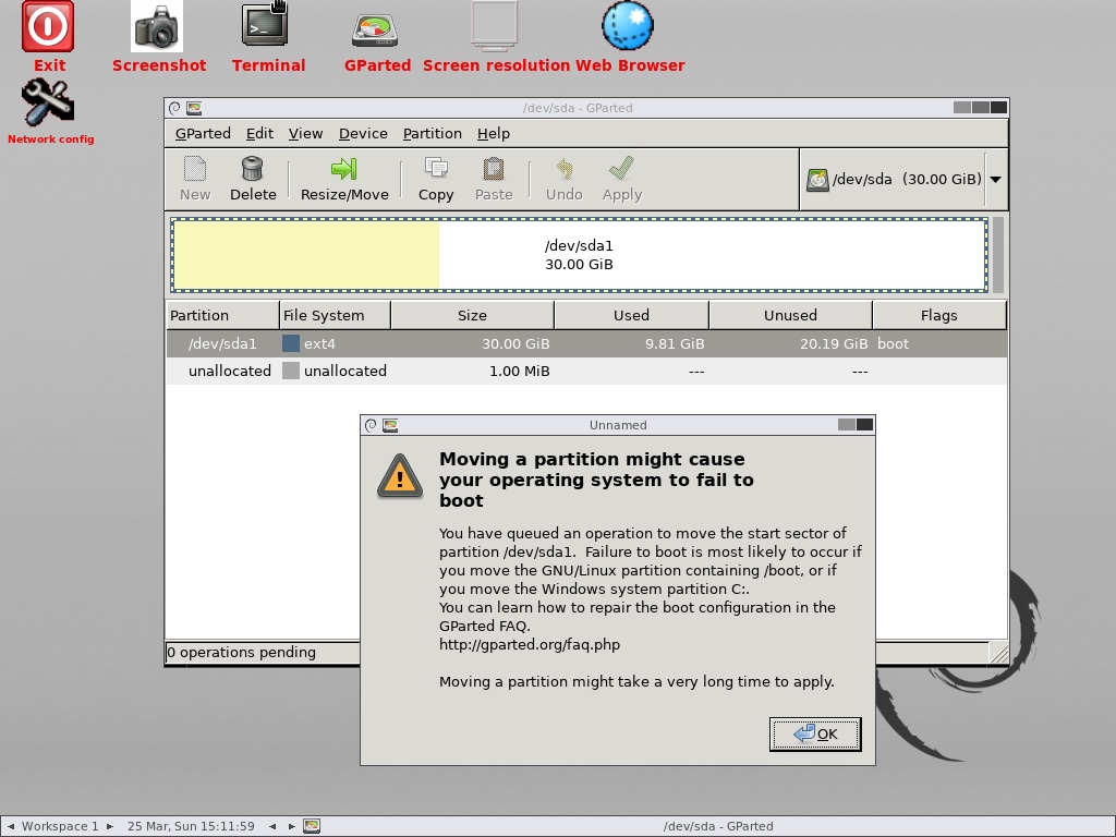 它将再次要求你确认重新调整分区的大小,因为你正在编辑活动的系统分区,然后点击 “Ok”。