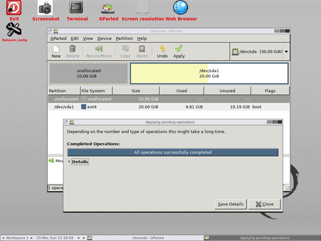 分区从 30GB 缩小到 20GB 已经成功。也显示 10GB 未分配的磁盘空间。