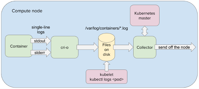 这样的旅程始于 OKD,因为该容器平台完全覆盖了它抽象的硬件。这意味着日志消息等待由驻留在容器中的应用程序写入 stdout 或 stderr 流。从那里,日志消息被容器引擎(例如 CRI-O)重定向到节点的文件系统。