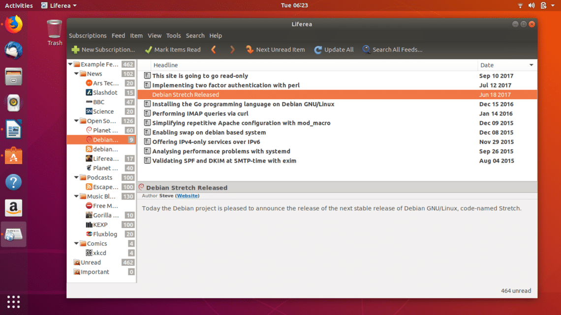 Liferea 自带与 TinyTinyRSS 的同步支持,它给了你离线阅读的能力。你会发现,就可靠性和灵活性而言,它是 Linux 上最好的订阅工具之一。