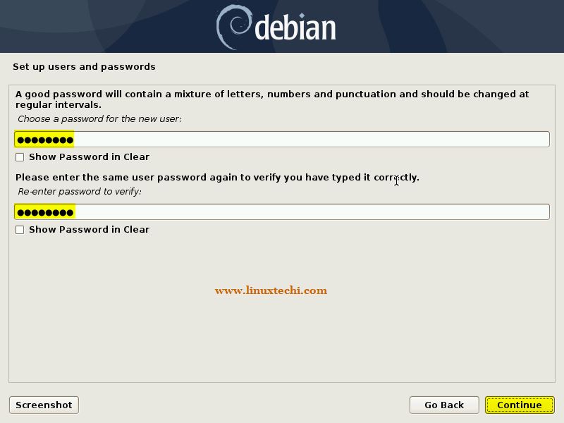 在下面的屏幕中指定 root 密码,然后在 “Continue” 上单击。