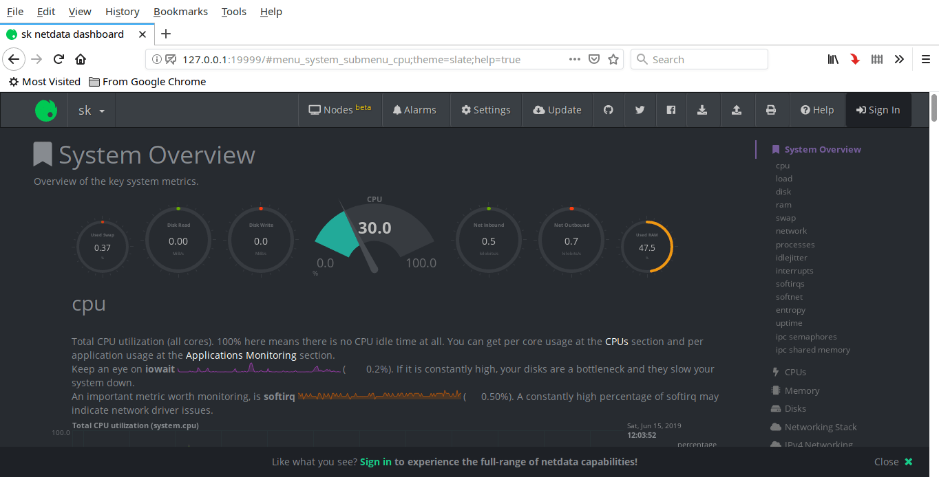打开 Web 浏览器,然后打开 http://127.0.0.1:19999 或者 http://localhost:19999/ 或者 http://ip-address:19999。你应该看到如下页面。