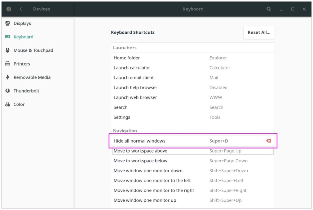 设置 » 设备 » 键盘 » 单击在导航下的 隐藏所有普通窗口 ,然后按 Super 键 + D ,最后按设置按钮来启用它。