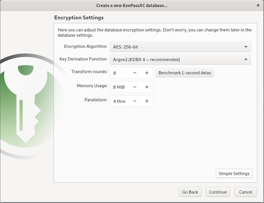 - 选择主密钥和额外保护:主密钥必须易于记忆(如果丢失它,你的皮夹就会丢失!)而足够强大,一个至少有 4 个随机单词的密码可能是一个不错的选择。作为额外保护,你可以选择密钥文件(请记住:你必须始终都有它,否则无法打开皮夹)和/或 YubiKey 硬件密钥。
