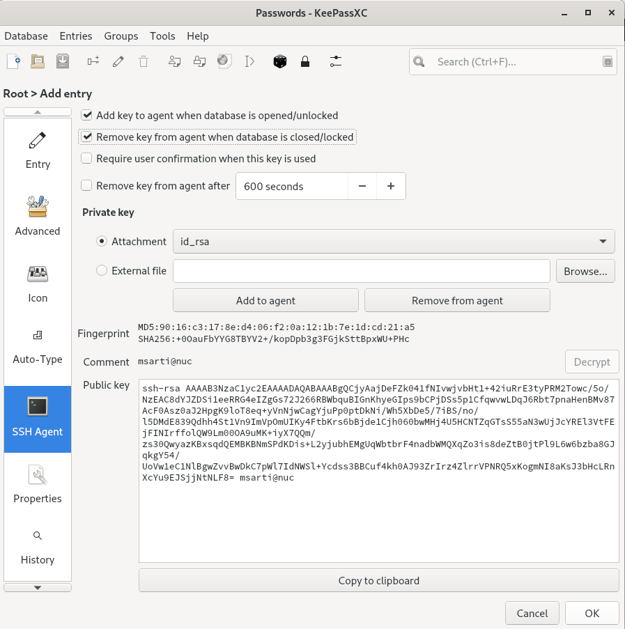 KeePassXC 的另一个有趣功能是与 SSH 集成。如果你使用 ssh 代理,KeePassXC 能够与之交互并添加你上传的 ssh 密钥到条目中。