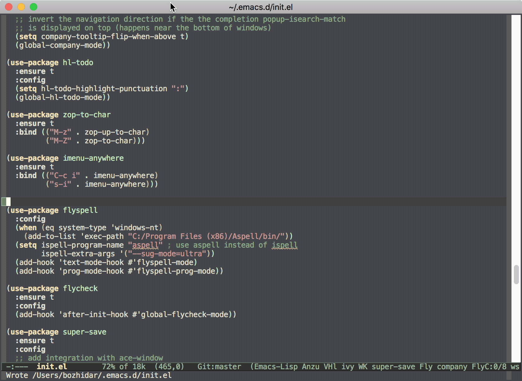 现在当你在注释中输入错误时,就会得到即时反馈了。要修复单词只需要将光标置于单词后,然后按下 C-c $ (M-x flyspell-correct-word-before-point)。(还有许多其他方法可以用 flyspell 来纠正拼写错误的单词,但为了简单起见,我们暂时忽略它们。)