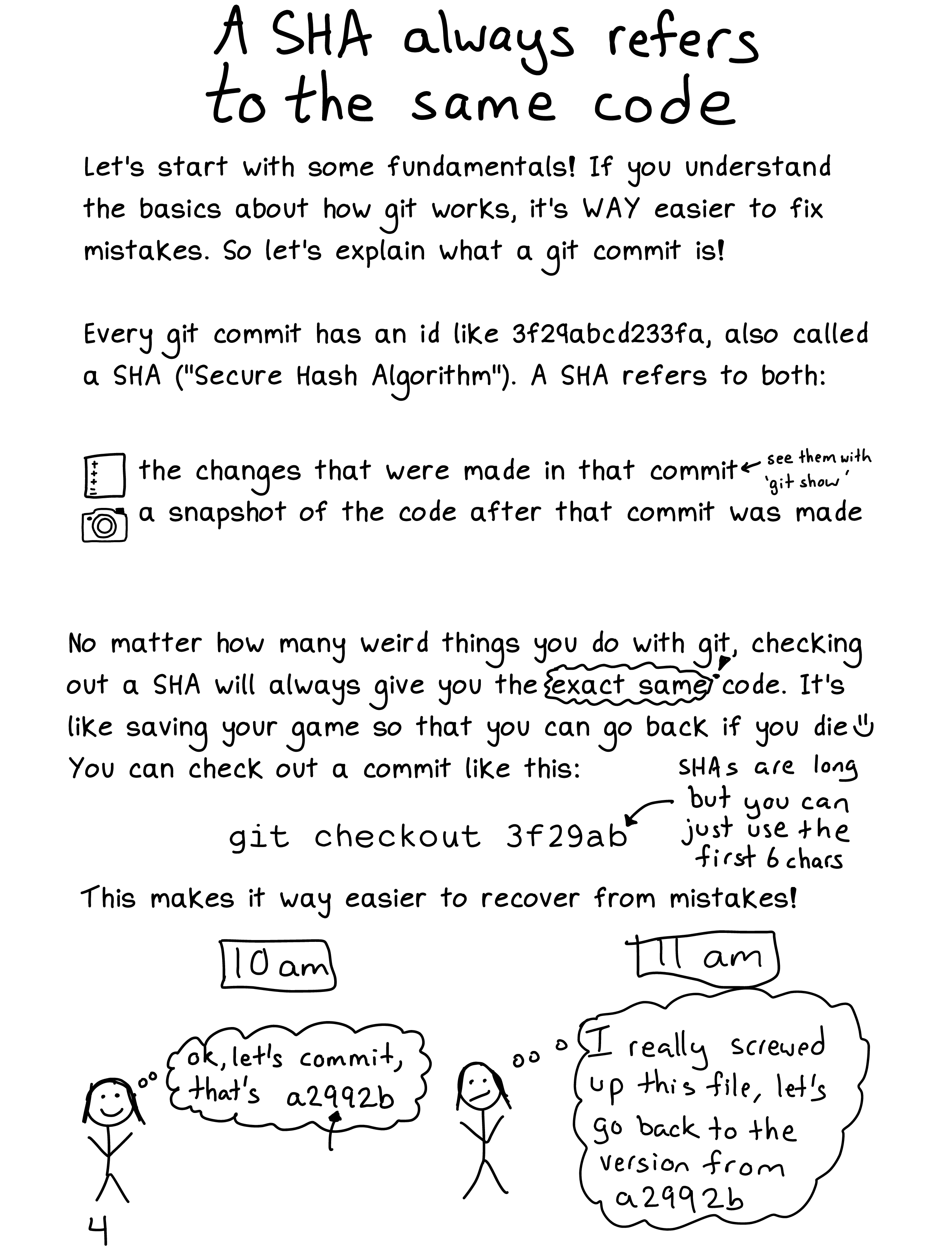 执行这些练习时要记住的最重要的一点是,如本页面所述,像9e3d9a2a009d2a0281802a84e1c5cc1c887edc71 这样的 Git SHA 始终引用同一个的代码。下图摘自我与凯蒂·西勒·米勒撰写的一本杂志,名为《Oh shit, git!》。(她还有一个名为 https://ohshitgit.com/ 的很棒的网站,启发了该杂志。)