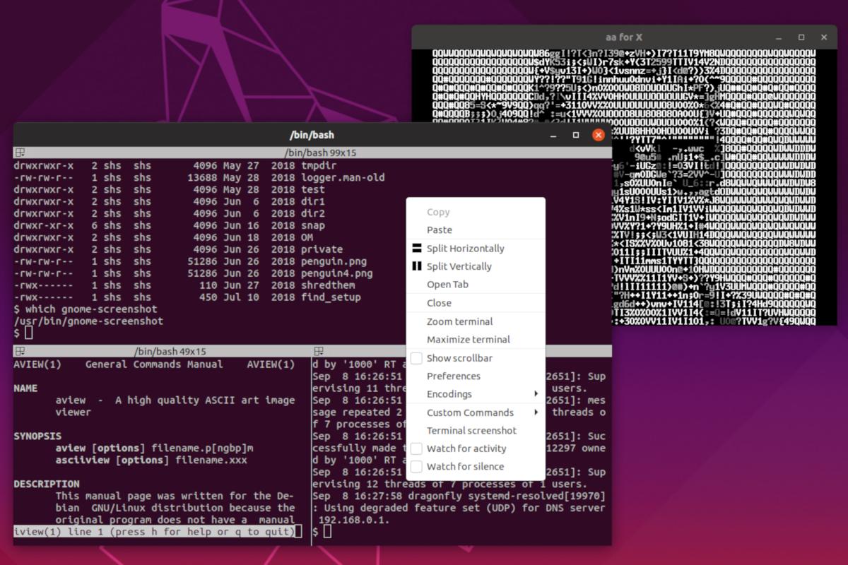 Terminator 最初打开像是一个单一窗口的终端窗口一样。但是,一旦在该窗口中单击鼠标,它将弹出一个选项,让你可以灵活地进行更改。你可以选择“水平分割”或“垂直分割”,将你当前所在的窗口分为两个较小的窗口。实际上,菜单旁会有小的分割结果图示(类似于 = and ||),你可以根据需要重复拆分窗口。当然,你如果将整个窗口分为六个或九个以上,那么你可能会发现它们太小而无法有效使用。
