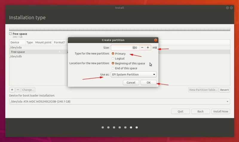 一般来说,100MB 足够 EFI 的使用,但是某些发行版可能需要更多空间,因此我要使用 500MB 的 EFI 分区。