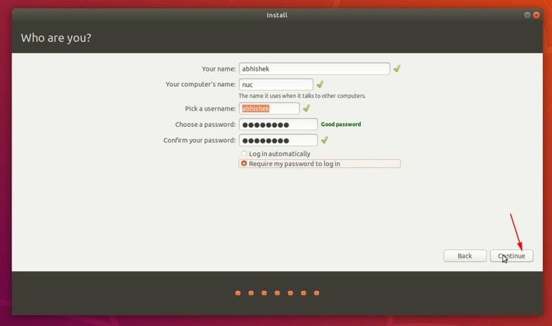 - “ 擦除磁盘并安装 Ubuntu Erase disk and install Ubuntu ”:最简单的选项,它将在整个磁盘上安装 Ubuntu。如果你只想在 Intel NUC 上使用一个操作系统,请选择此选项,Ubuntu 将负责剩余的工作。