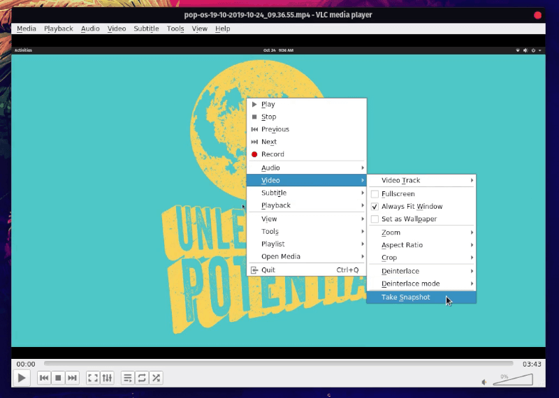 你可以在观看视频时使用 VLC 获取一些视频的截图/图像。你只需在视频播放/暂停时右击播放器,你会看到一组选项,点击 “Video”->“Take Snapshot”。