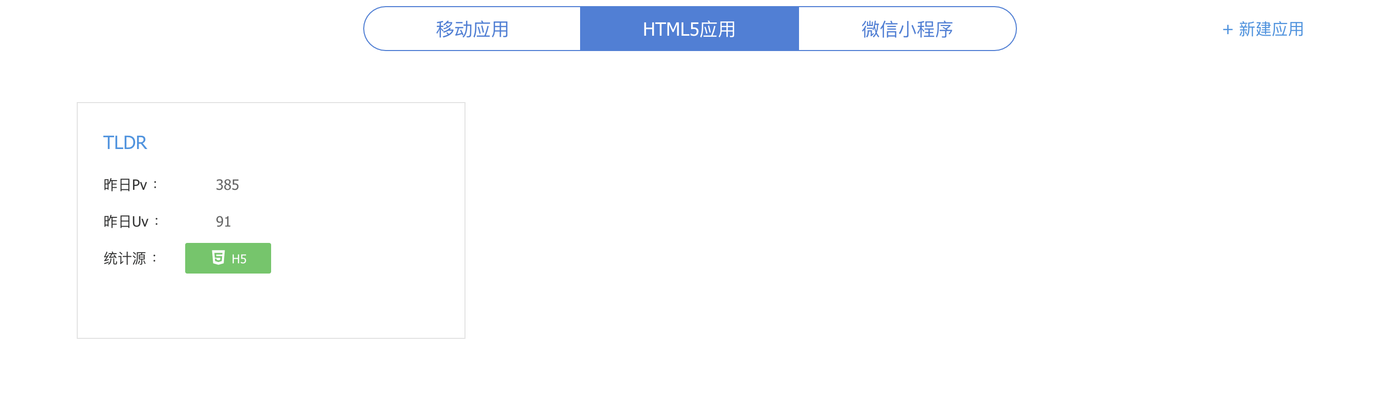 在应用统计领域,可选项非常多,大部分人使用的是 Google Analytics ,不过由于这个产品的面向用户主要是国内的用户,因此我更倾向选择加载速度更快的产品,最终我选择的是来自腾讯的移动应用分析(MTA),腾讯的移动应用分析中,提供了 HTML5 产品的接入,因此可以完成 TLDR 的统计。
