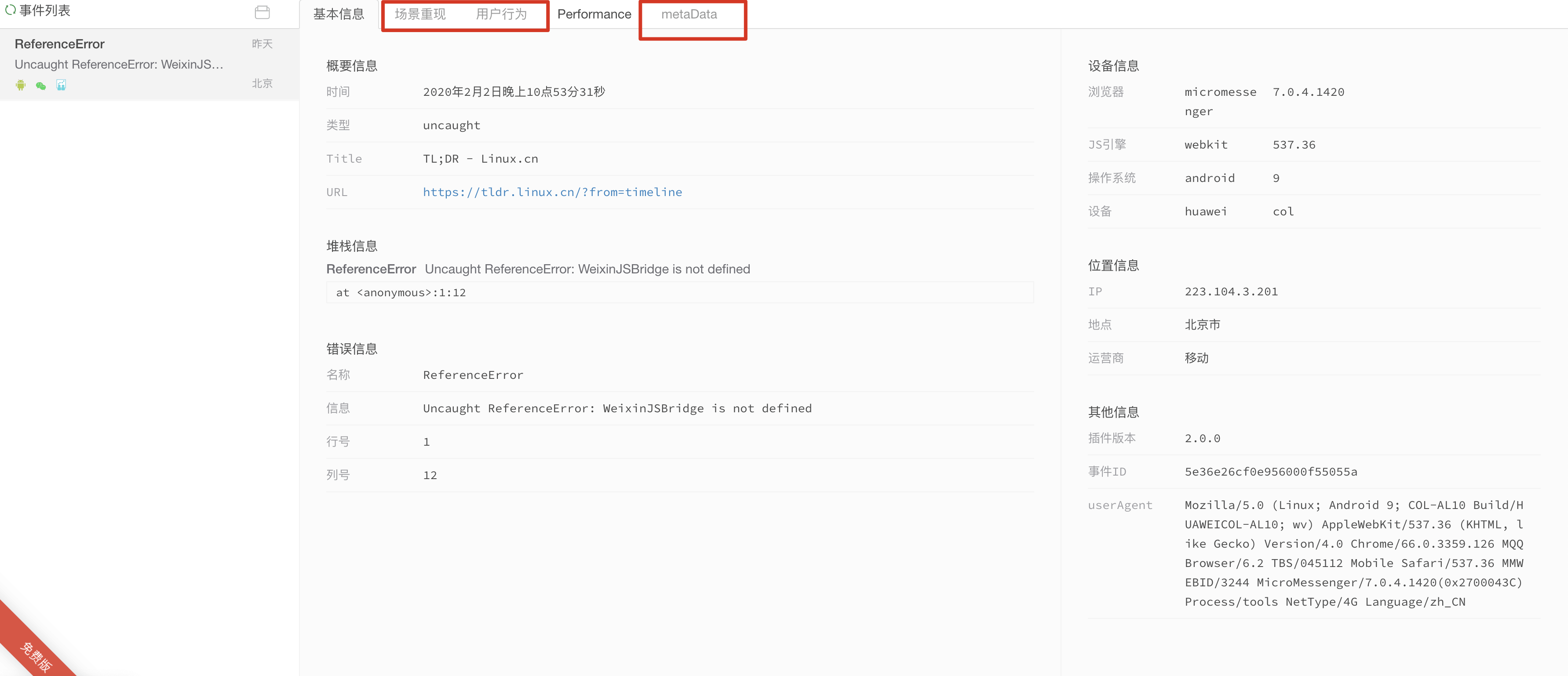 • Crash 收集:人无完人,很难开发出一个完美的应用,就随时有可能会出现应用报错的情况。出现报错以后由于用户的水平不同,有效的反馈其实很少。Crash 收集则可以帮助收集必要的 Crash 信息,从而在后续开发的过程中,有针对性的修复 Bug。