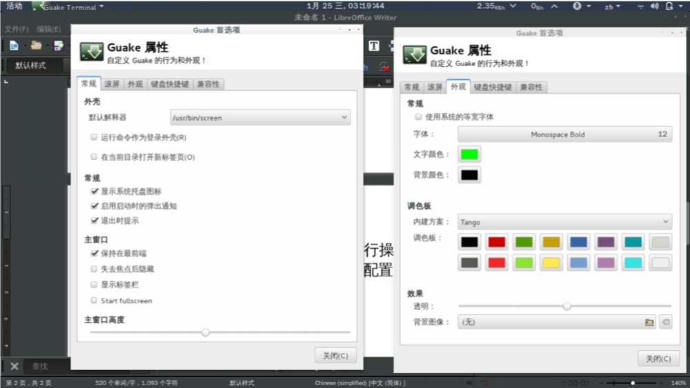 将其加入 gnome3 的开机启动程序,之后只要使用功能键 F12 就可以直接唤入唤出该终端进行命令行操作。F12 唤出后可右键点击首选项进行设置,建议用户参考如图配置: