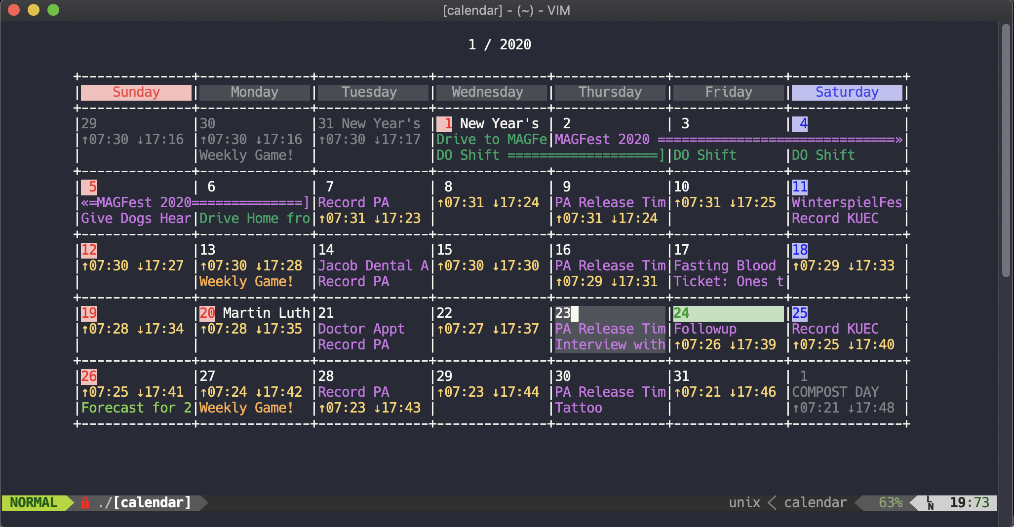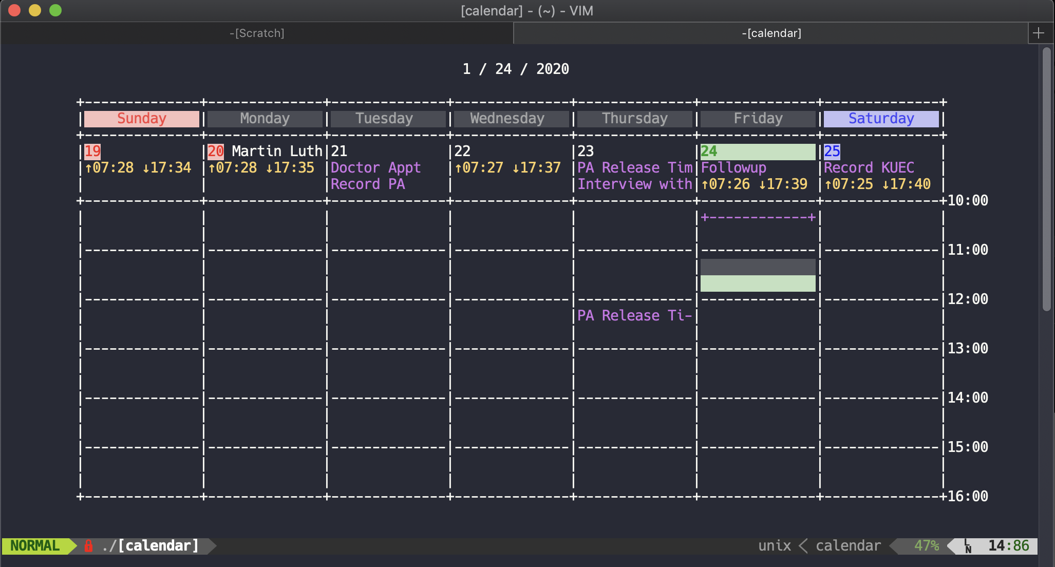 遗憾的是,似乎没有使用 vCalendar 或 iCalendar 格式的 Vim 日历程序。有个 Calendar.vim,做得很好。设置 Vim 通过以下方式访问你的日历: